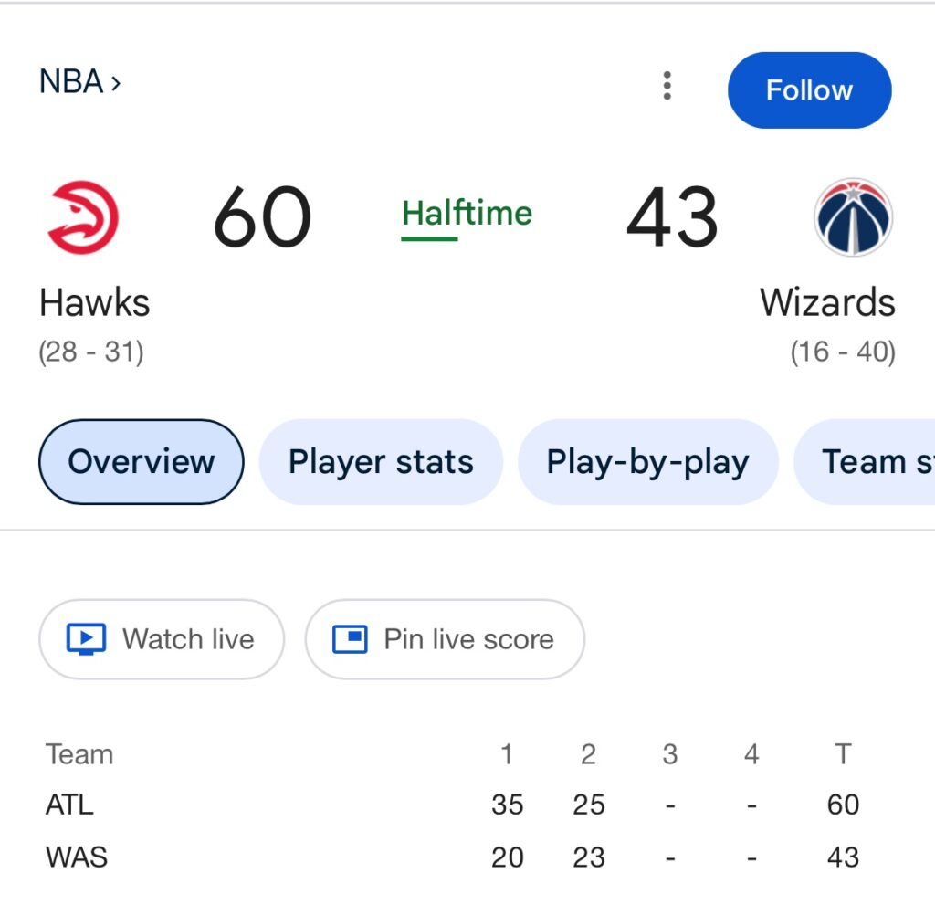 Score was 10-6 in play and Hawks have 60 points at half time